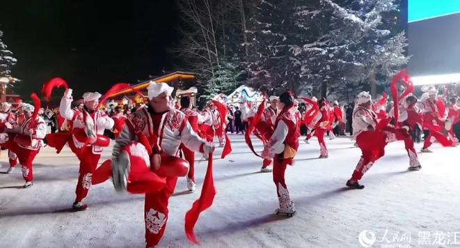 随着夜幕降临,一阵激昂而富有节奏感的鼓点响起,来自陕西的安塞腰鼓演员们身着艳丽的陕西传统民俗服饰,腰系红鼓,带着陕北风情,从黄土高原走进童话雪乡。演员们身姿矫健,用力挥槌踢腿、转身跳跃,动作整齐划一,队形灵活多变,令人目不暇接。火红的服装与周围的雪景形成了鲜明对比,仿佛是冬日里的一抹火焰,吸引着四面八方的游客汇聚而来。